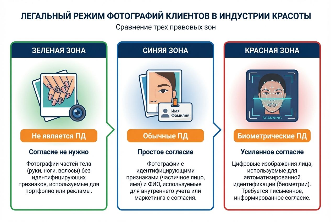 То, что фото «до/после» — не биометрия, не означает полную свободу его использования. Есть три правовых режима, и важно понимать разницу.