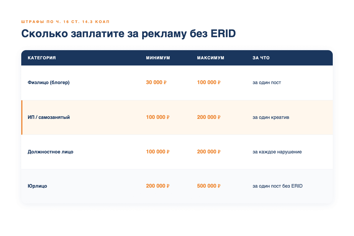 | ч. 16 | Реклама в интернете без ERID | 30 000 – 100 000 ₽ | 100 000 – 200 000 ₽ | 200 000 – 500 000 ₽ |